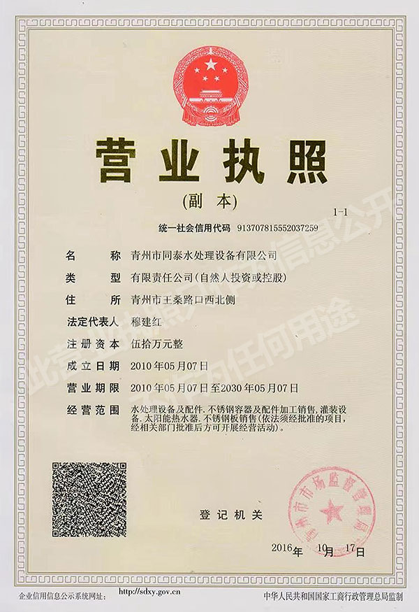 青州市同泰水處理設(shè)備有限公司是一家從事純凈水生產(chǎn)線(xiàn)、軟化水設(shè)備、純凈水設(shè)備、不銹鋼水箱、水處理設(shè)備等各種水處理設(shè)備生產(chǎn)和銷(xiāo)售的企業(yè),主要產(chǎn)品有:純凈水設(shè)備、礦泉水設(shè)備、軟化水設(shè)備、超純水設(shè)備、不銹鋼容器及各種水處理設(shè)備配件和配套灌裝設(shè)備,公司位于青州經(jīng)濟(jì)技術(shù)開(kāi)發(fā)區(qū),濱臨309國(guó)道。
